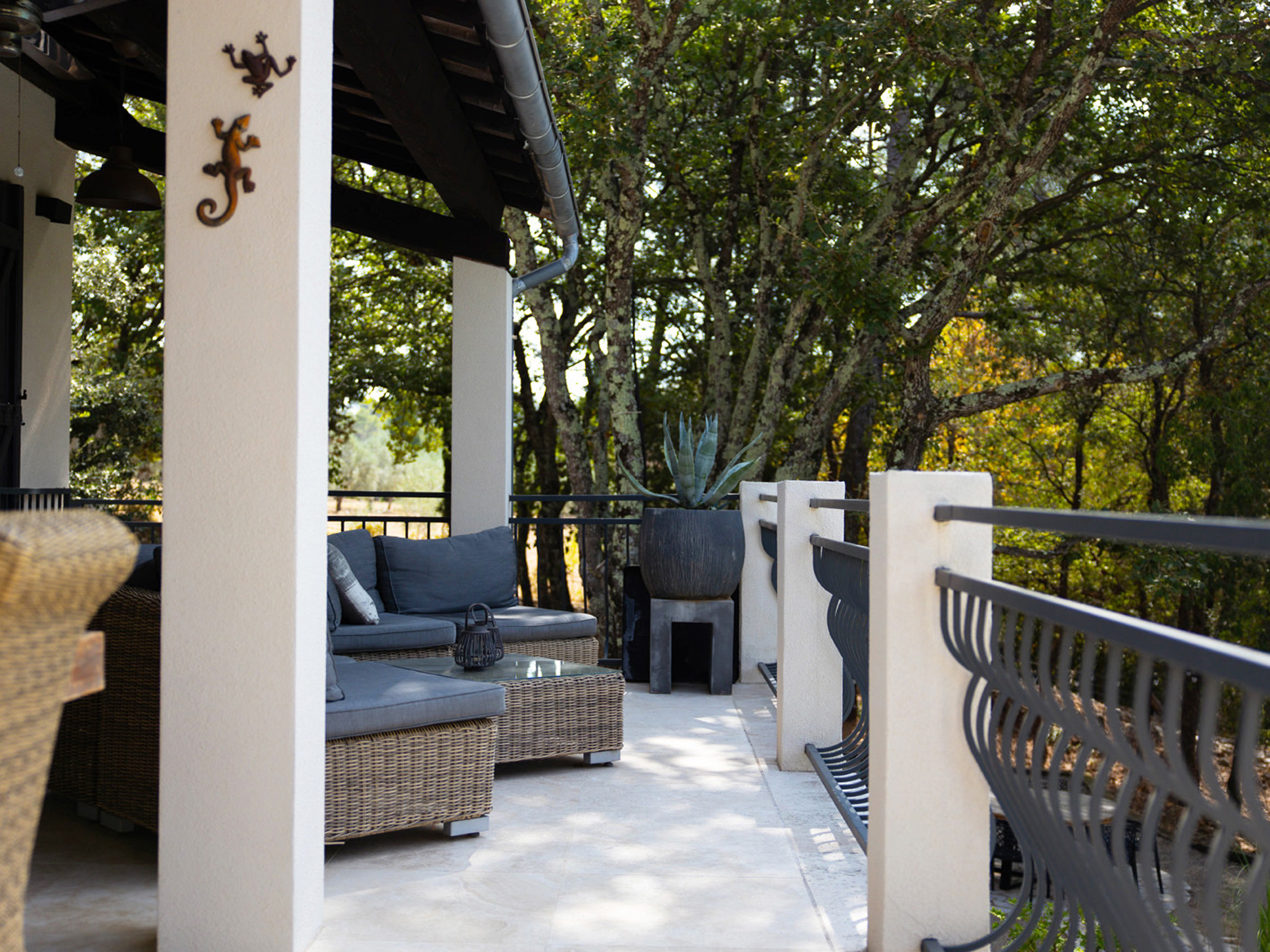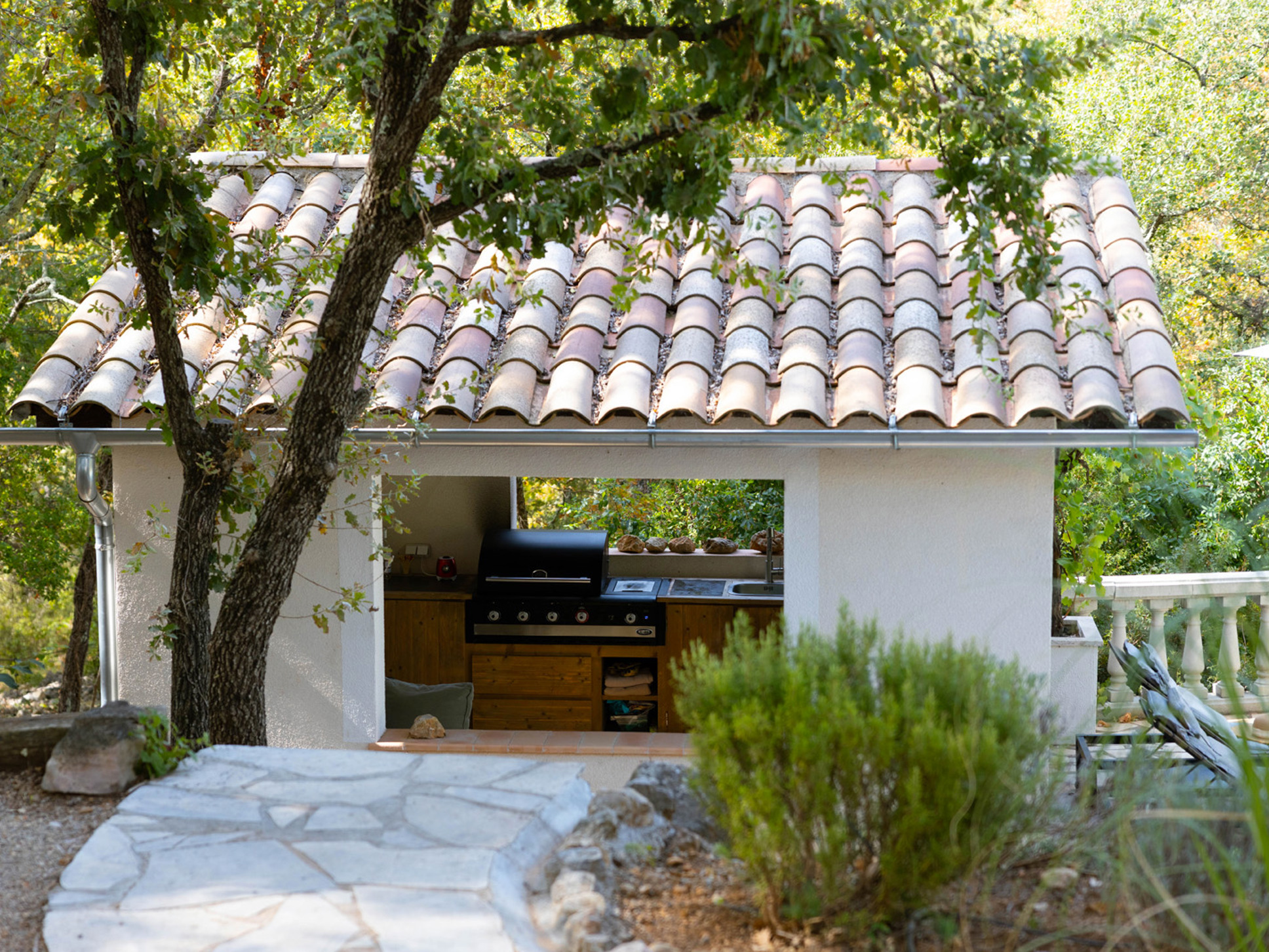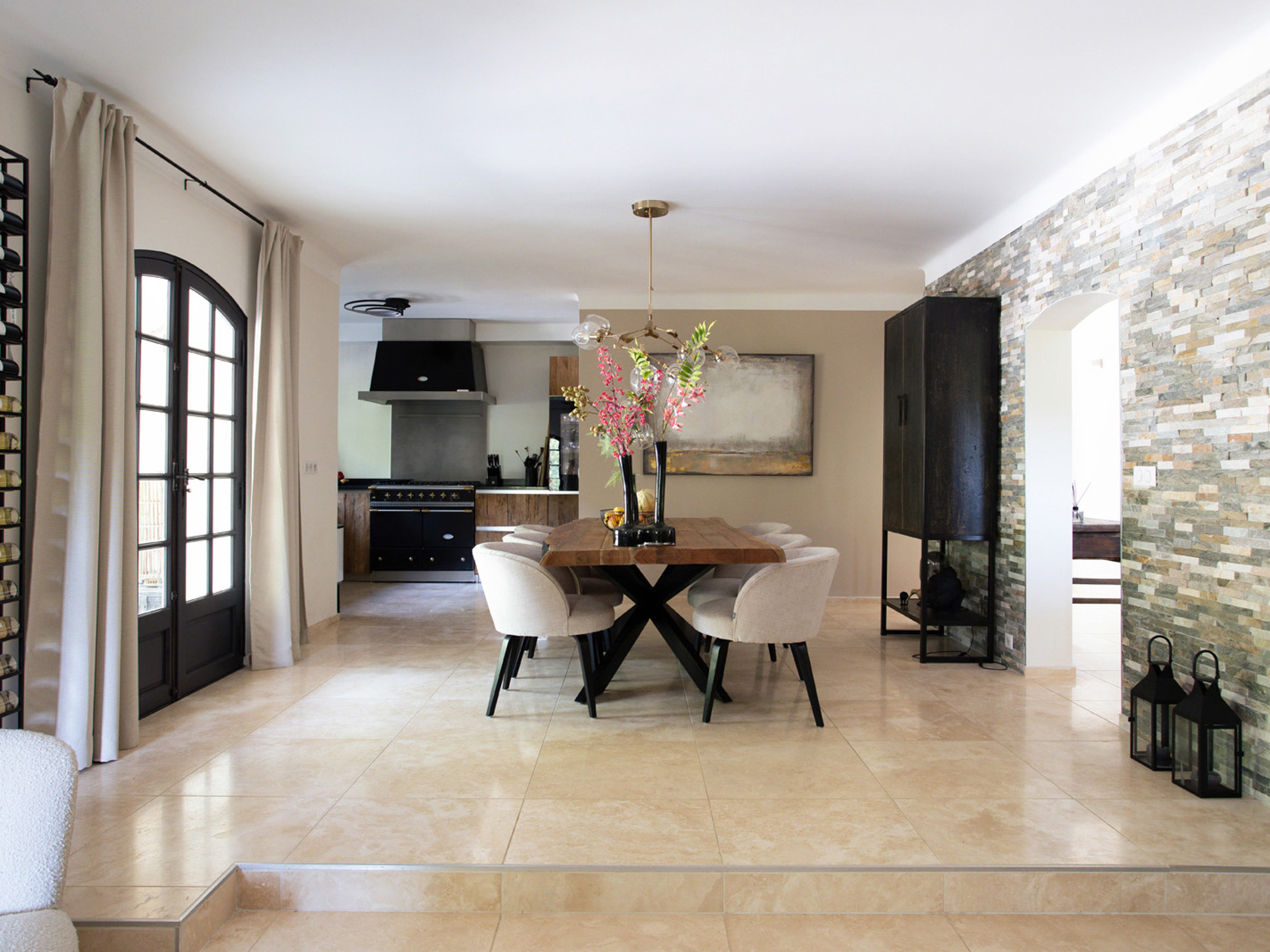 Via openslaande deuren bereikt u direct de ruime, overdekte veranda. Hier vindt u meerdere uitnodigende zithoeken, een sfeervolle buitenhaard en een grote eettafel met een prachtig uitzicht op het zwembad en de omliggende Provençaalse heuvels. Vanuit de zithoek leidt een klein opstapje naar het eetgedeelte en de open keuken.