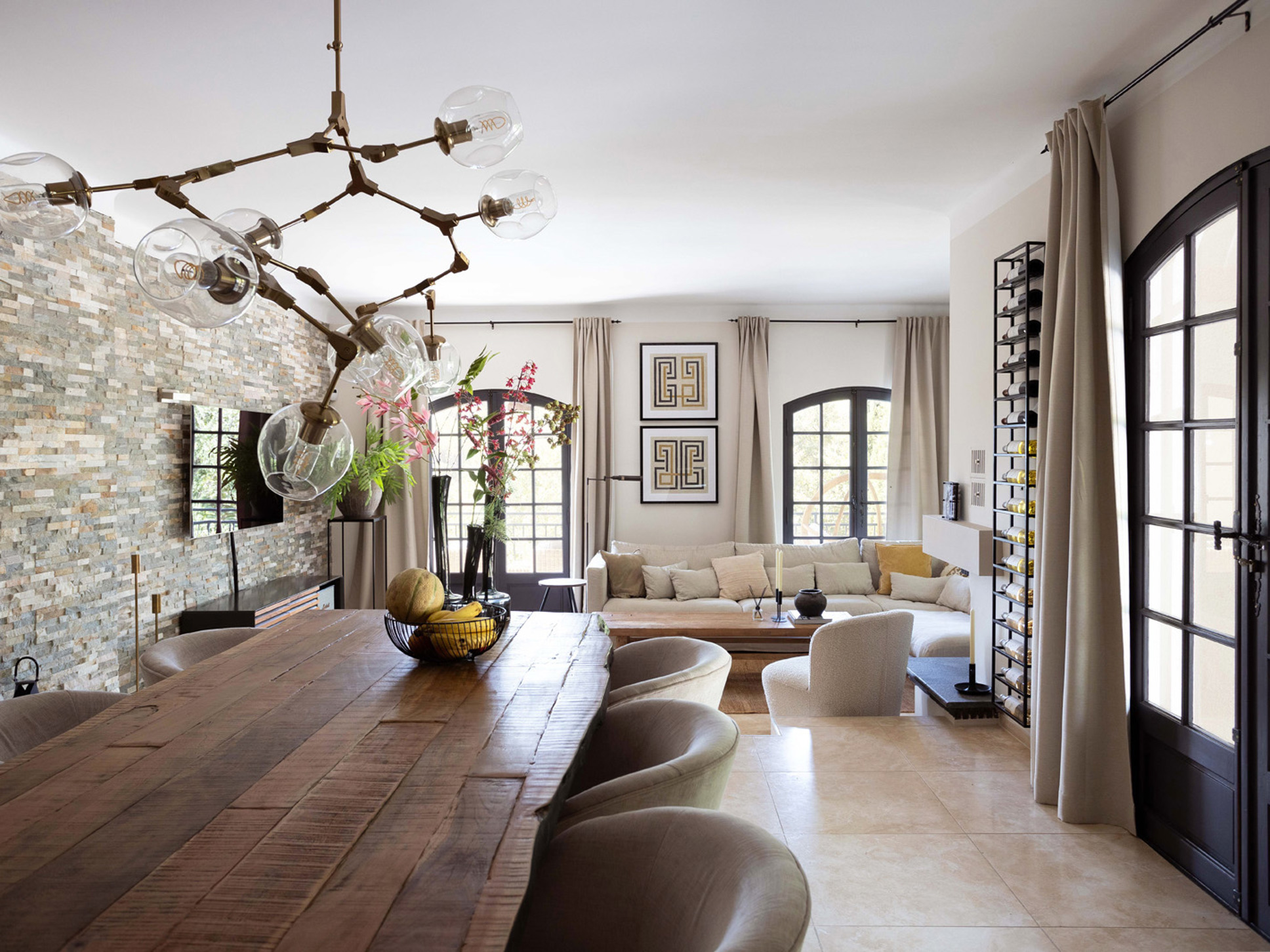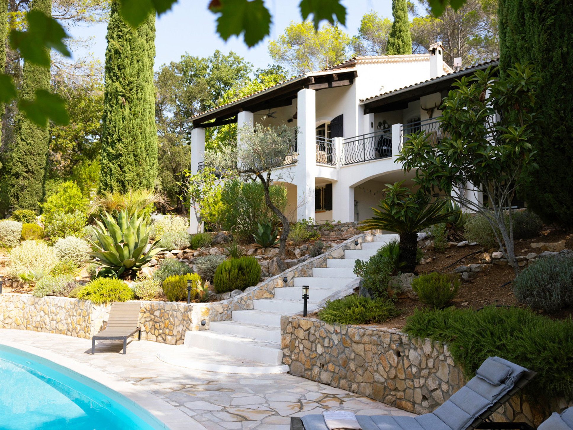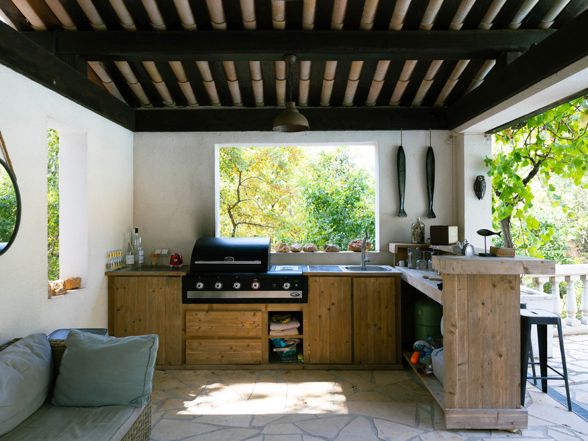 Via openslaande deuren bereikt u direct de ruime, overdekte veranda. Hier vindt u meerdere uitnodigende zithoeken, een sfeervolle buitenhaard en een grote eettafel met een prachtig uitzicht op het zwembad en de omliggende Provençaalse heuvels. Vanuit de zithoek leidt een klein opstapje naar het eetgedeelte en de open keuken.