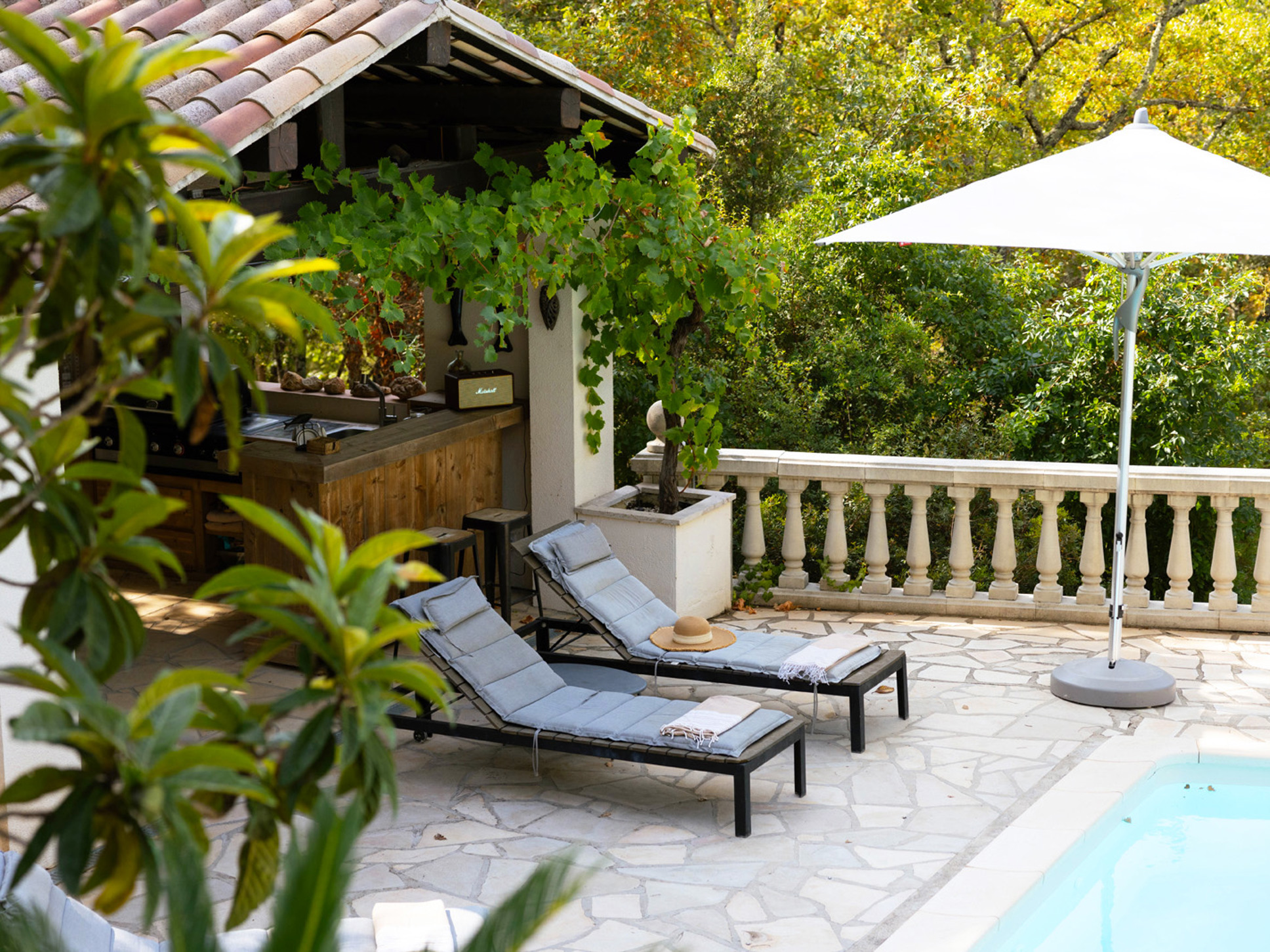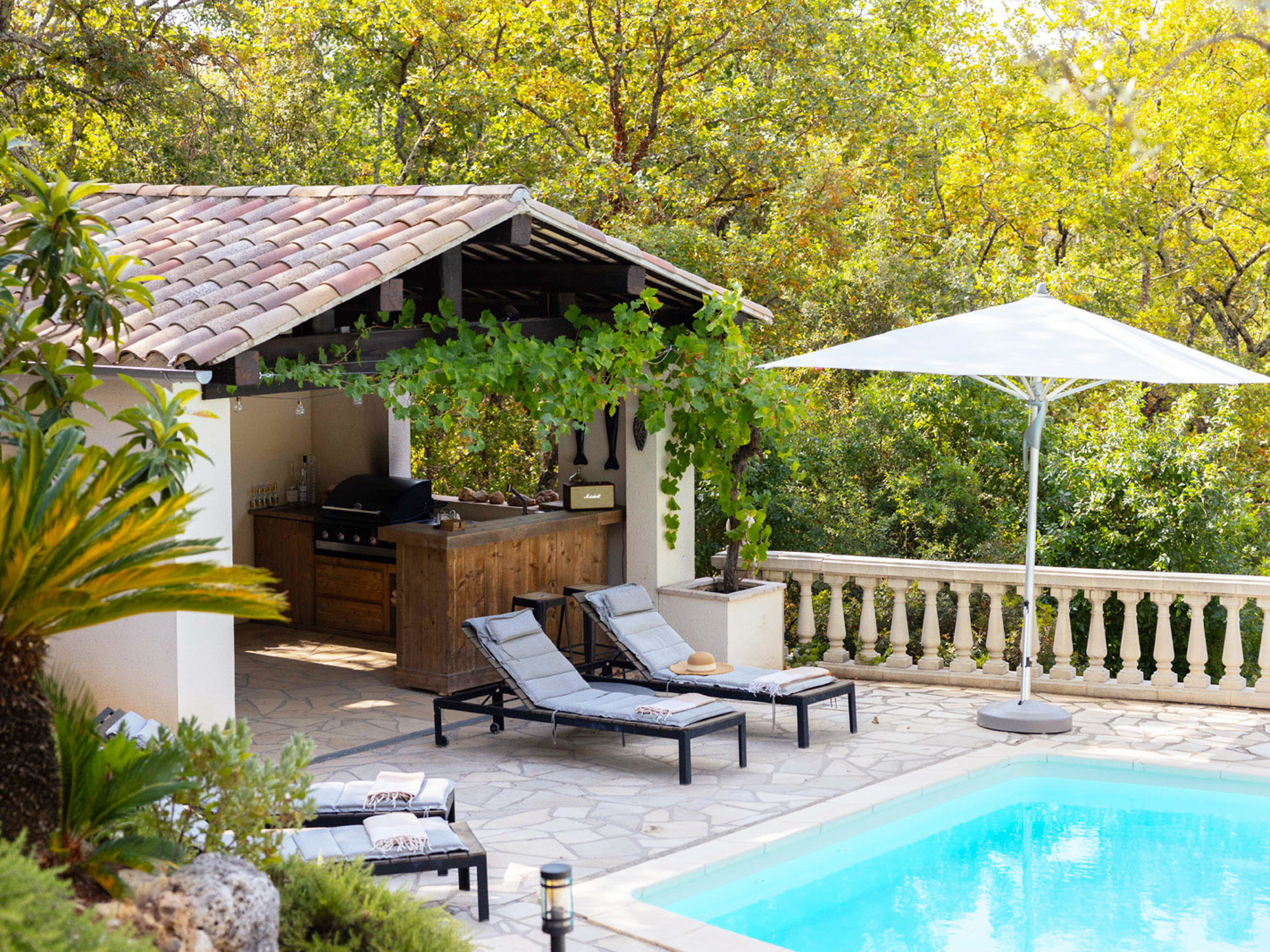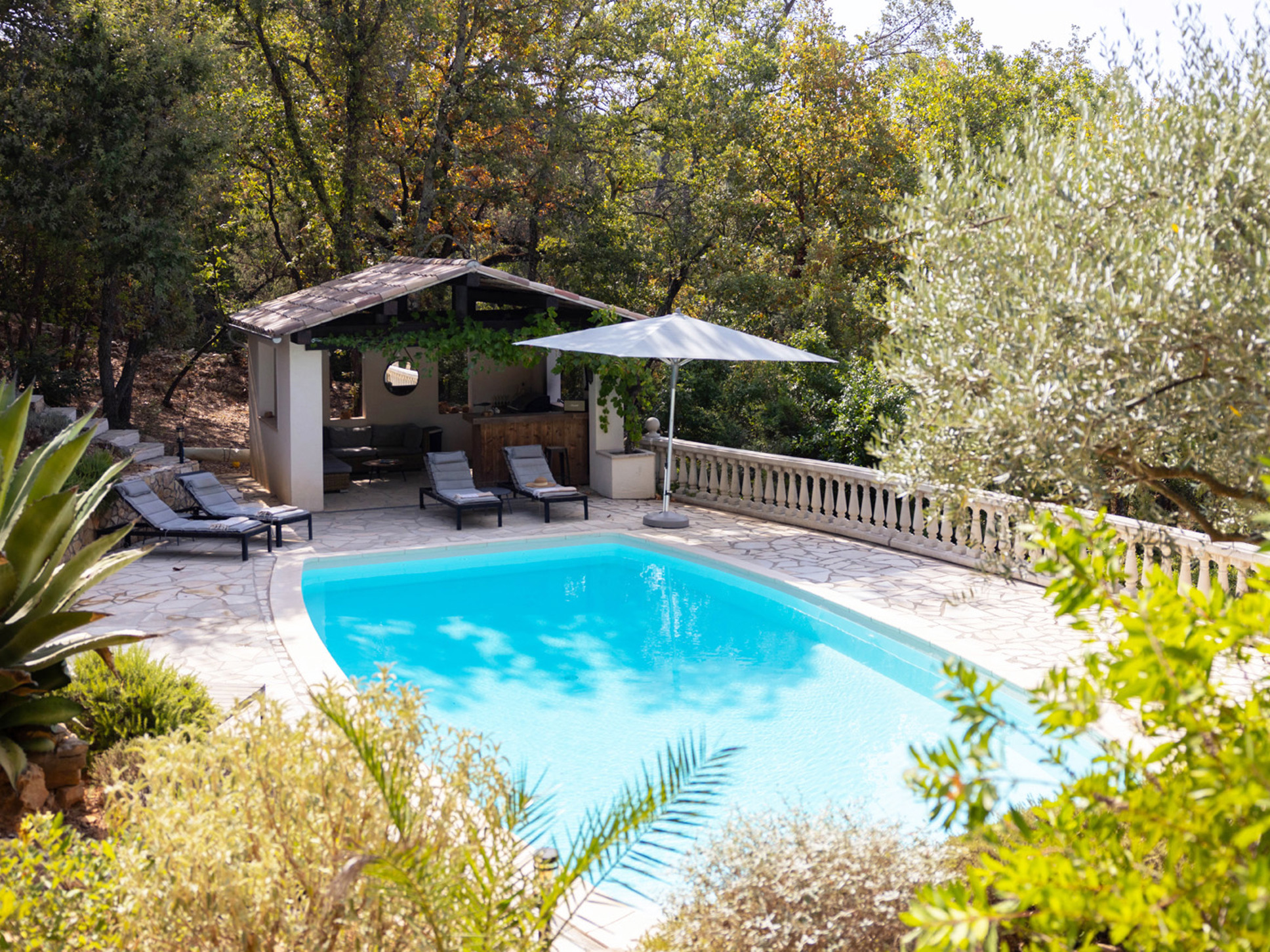 Het zwembad (10 x 4 meter) is gemakkelijk bereikbaar via een brede, comfortabele trap. Rondom het zwembad ligt een ruim zonneterras met luxe ligstoelen en parasols. Direct bij het zwembad bevindt zich ook een sfeervol poolhouse met buitenkeuken, bar en loungebank. De buitenkeuken is voorzien van een koelkast, een BBQ met infraroodgrill en een plancha.