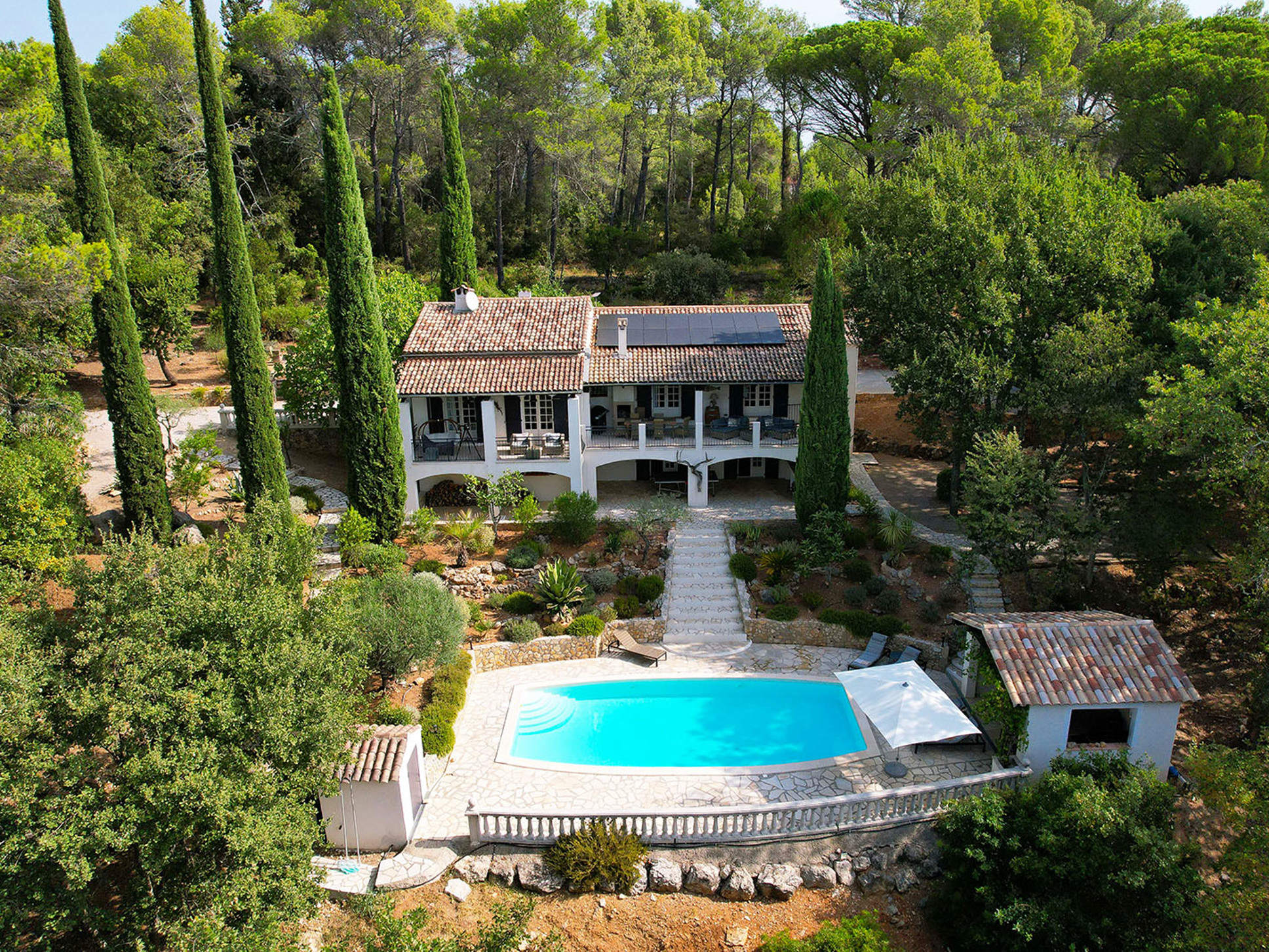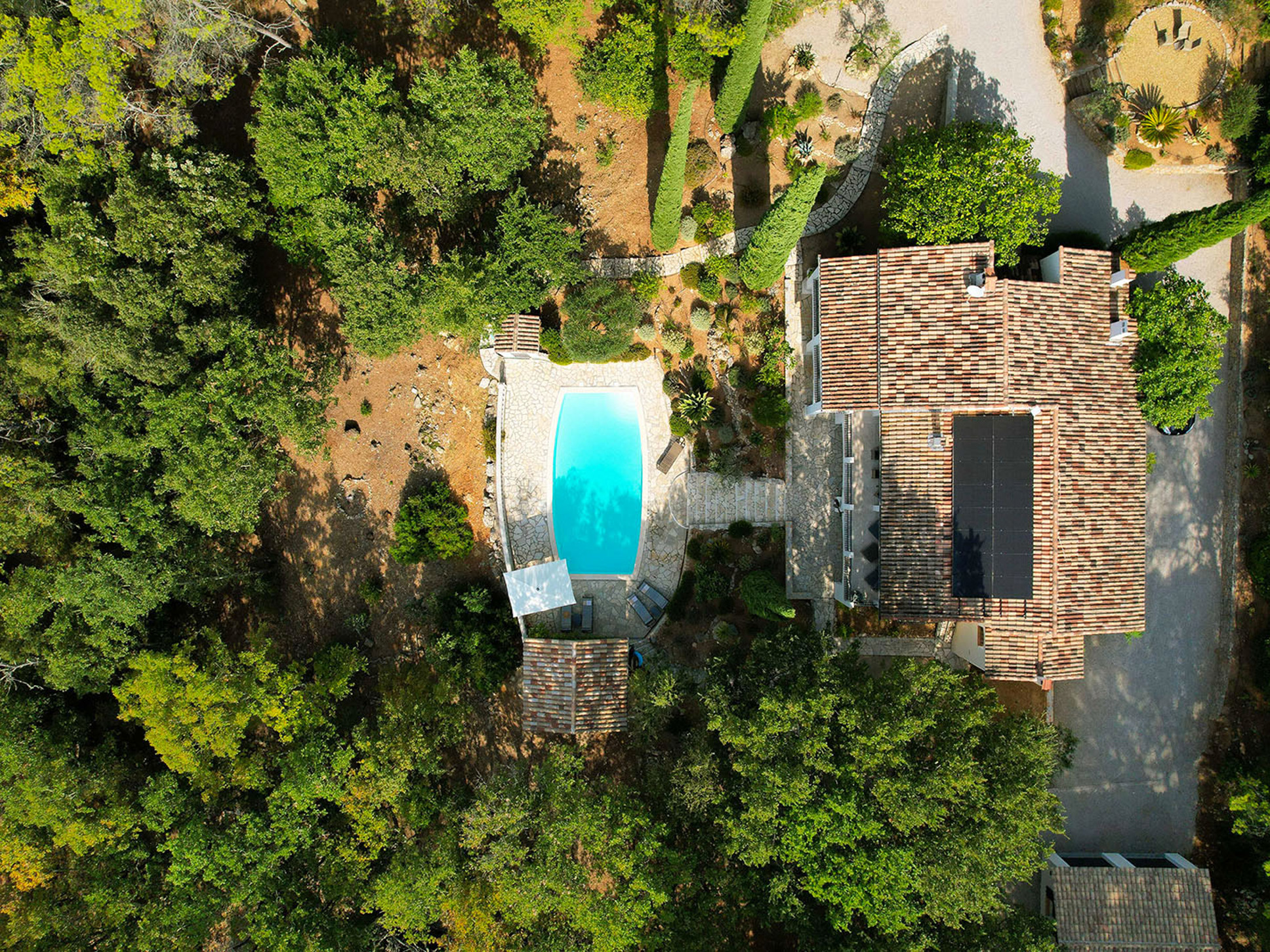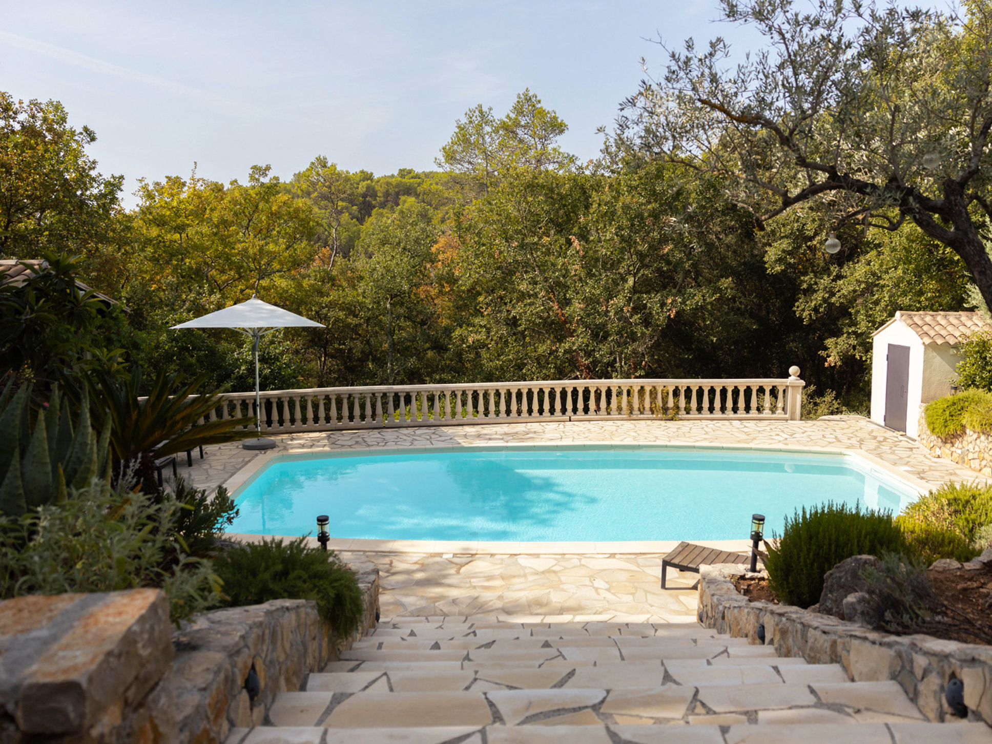 Het zwembad (10 x 4 meter) is gemakkelijk bereikbaar via een brede, comfortabele trap. Rondom het zwembad ligt een ruim zonneterras met luxe ligstoelen en parasols. Direct bij het zwembad bevindt zich ook een sfeervol poolhouse met buitenkeuken, bar en loungebank. De buitenkeuken is voorzien van een koelkast, een BBQ met infraroodgrill en een plancha.