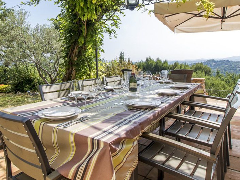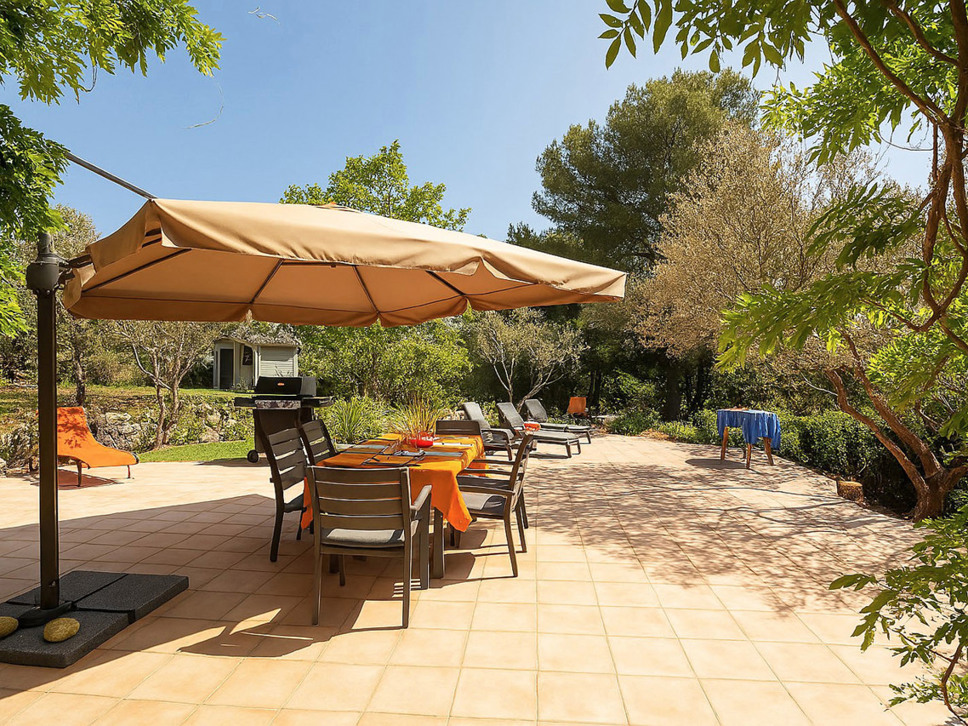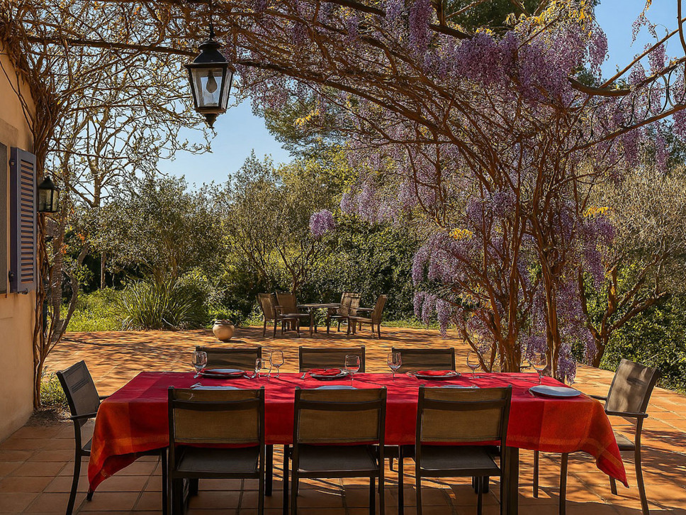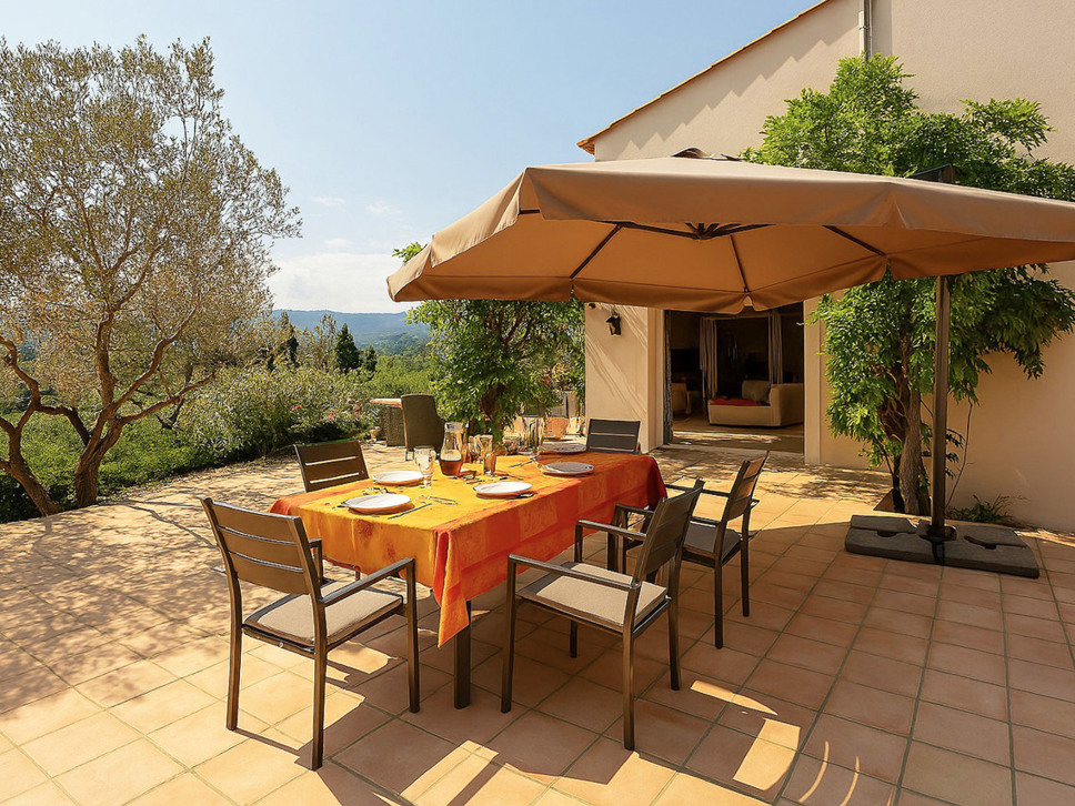 De villa beschikt over meerdere terrassen, zogenaamd ""Restanques"". Zo kunt u op ieder moment van de dag heerlijk genieten van de zon of de schaduw. Langs de gehele voorzijde van de Bastide is een royaal terras welke overdekt wordt door een Pergola. Aan de zijkant van de villa op het terras onder een luifel met klimop staat een grote eettafel. Een mooie plek voor een glas rosé, lunch of diner.