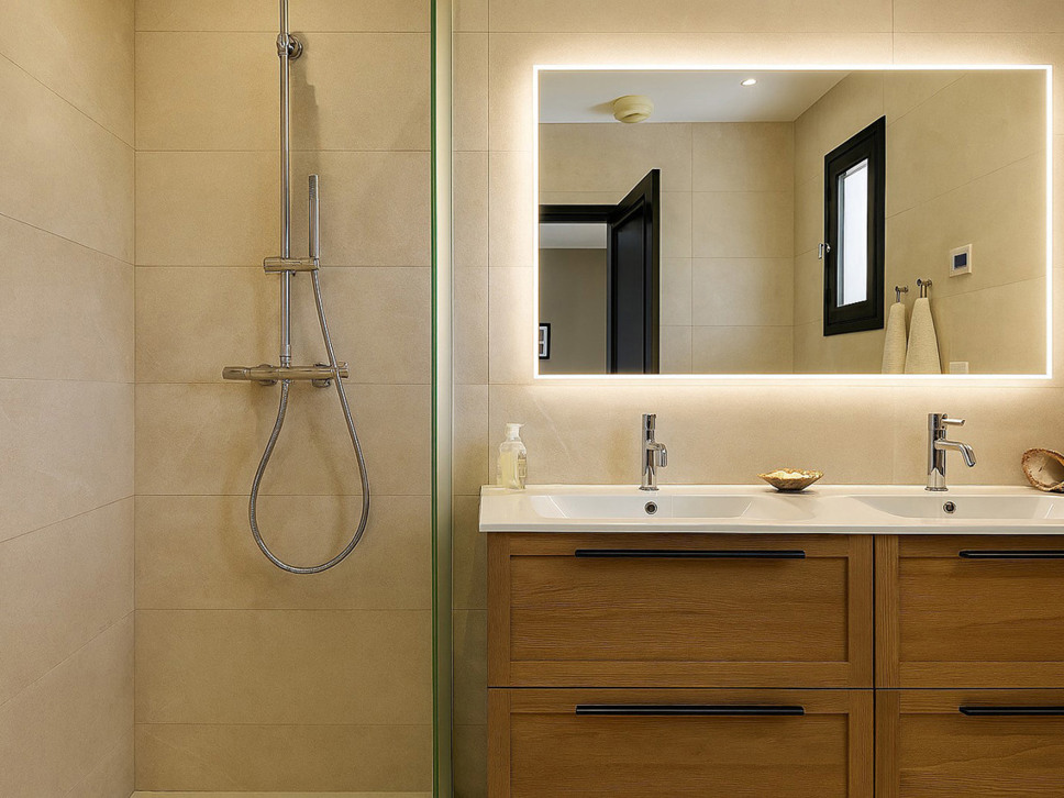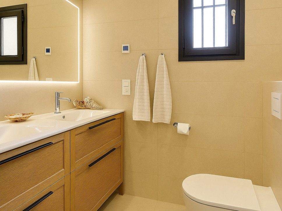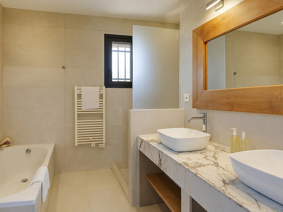 Slaapkamer 3 heeft een tweepersoonsbed (160x200) en slaapkamer 4 biedt twee eenpersoonsbedden (2x90x200) ideaal voor kinderen of tieners. Slaapkamers 3 en 4 delen een badkamer (bad, douche, wastafel en WC).