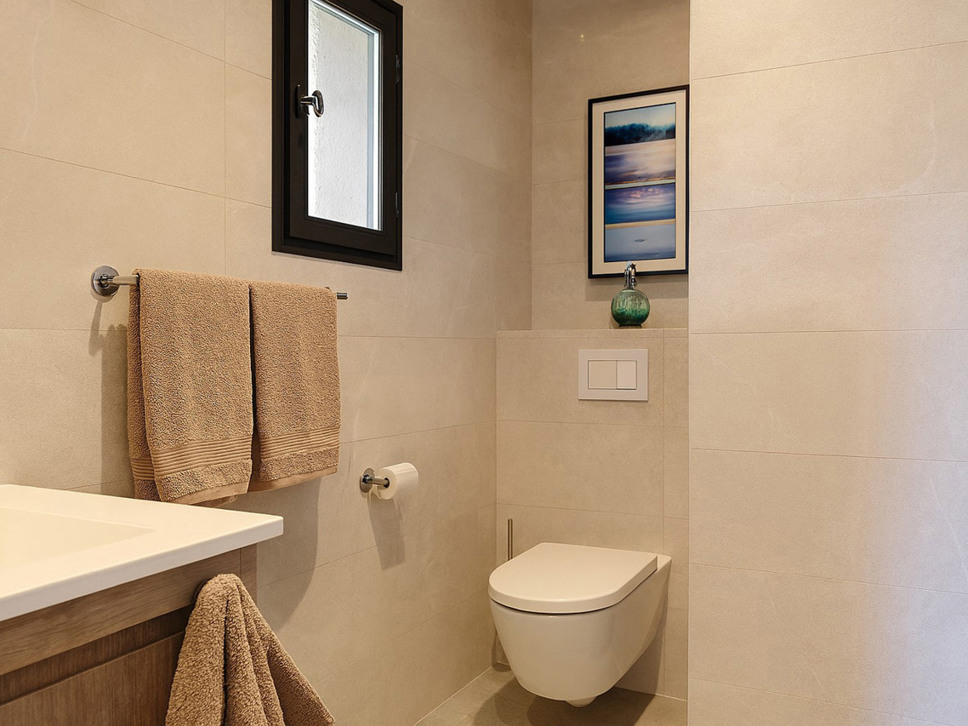 In de avond zorgen de lichten van de omliggende dorpen voor een fraai uitzicht. De begane grond heeft ook een gastentoilet en een aparte wasruimte met een wasmachine en een droger. De gehele villa is voorzien van een centraal aircosysteem en elke slaapkamer kan individueel worden geregeld.