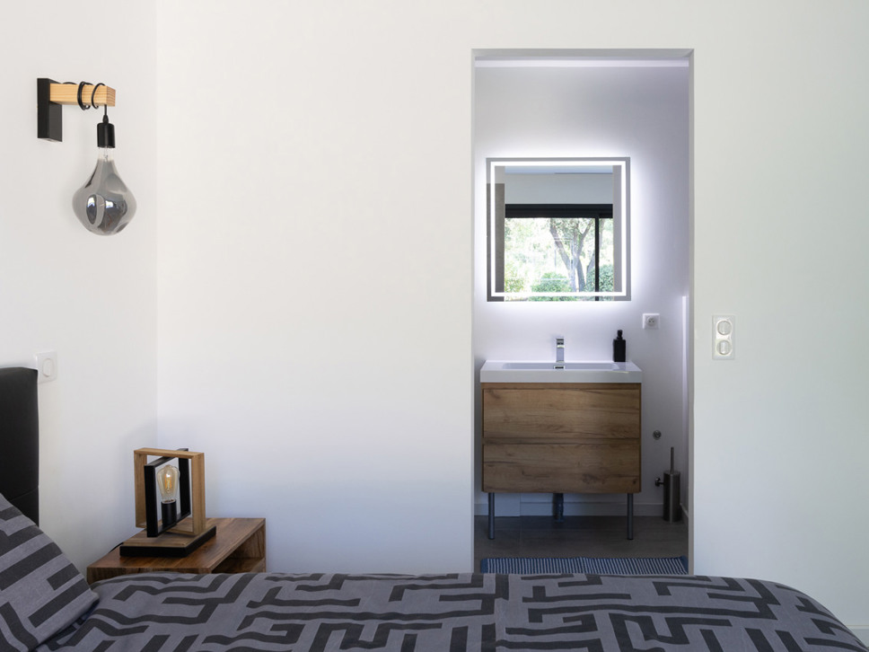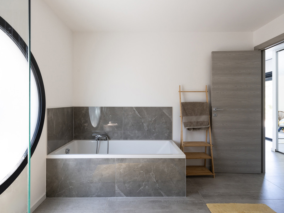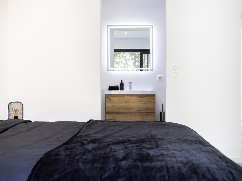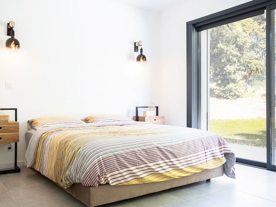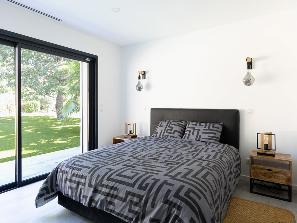 De villa beschikt over 5 slaapkamers en 5 en-suite badkamers. Slaapkamer 1 is de ouder slaapkamer en deze biedt een tweepersoonsbed van 180x200. Leuk detail is het grote ronde raam en de toegang tot het terras met zwembad.