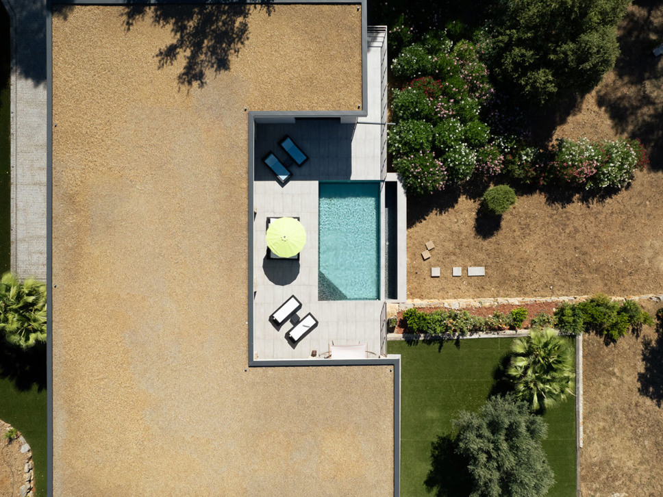 De onder architectuur gebouwde villa ligt op een geheel vlak en omheind terrein (5200 m2) en is geheel gelijkvloers. Er is voldoende ruimte om te parkeren op eigen terrein.