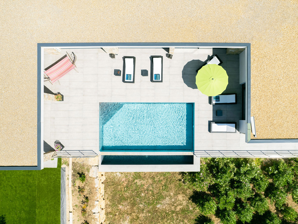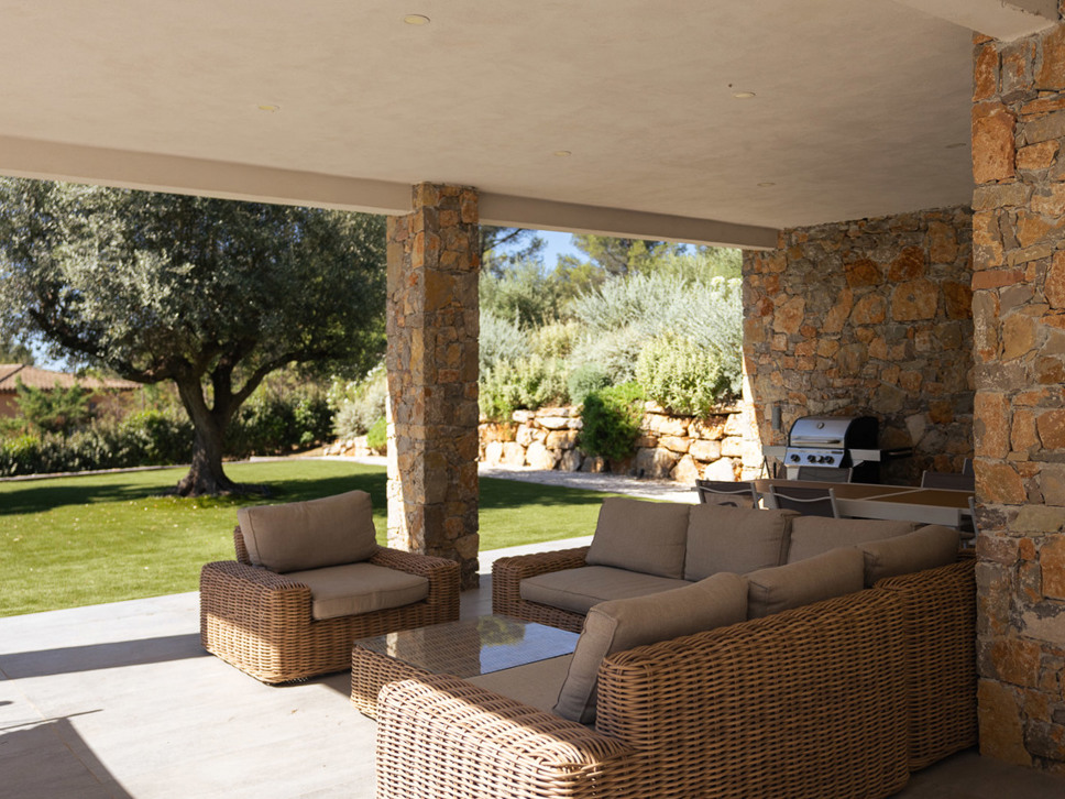Het privé zwembad (verwarmd) is voorzien van een 3/4 omsloten zonneterras met diverse ligbedden en parasols. Het overdekte terras biedt prettige verkoeling. Onder het overdekte terras staat een comfy XL loungeset en een grote eettafel. Ook is er een zomerkeuken met BBQ.