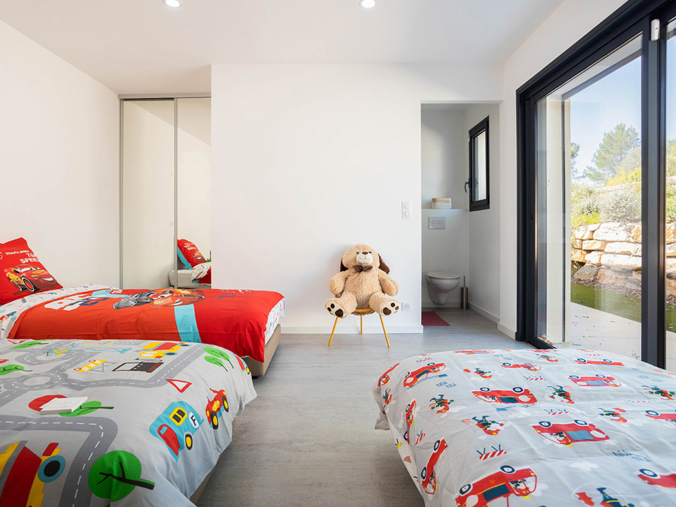 Slaapkamer 5 is de kinderslaapkamer met 3 eenpersoonsbedden van 90x190.