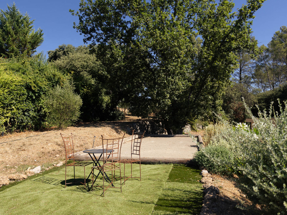 De jeu-de-boulesbaan ligt aan de zijkant van de woning in de tuin.