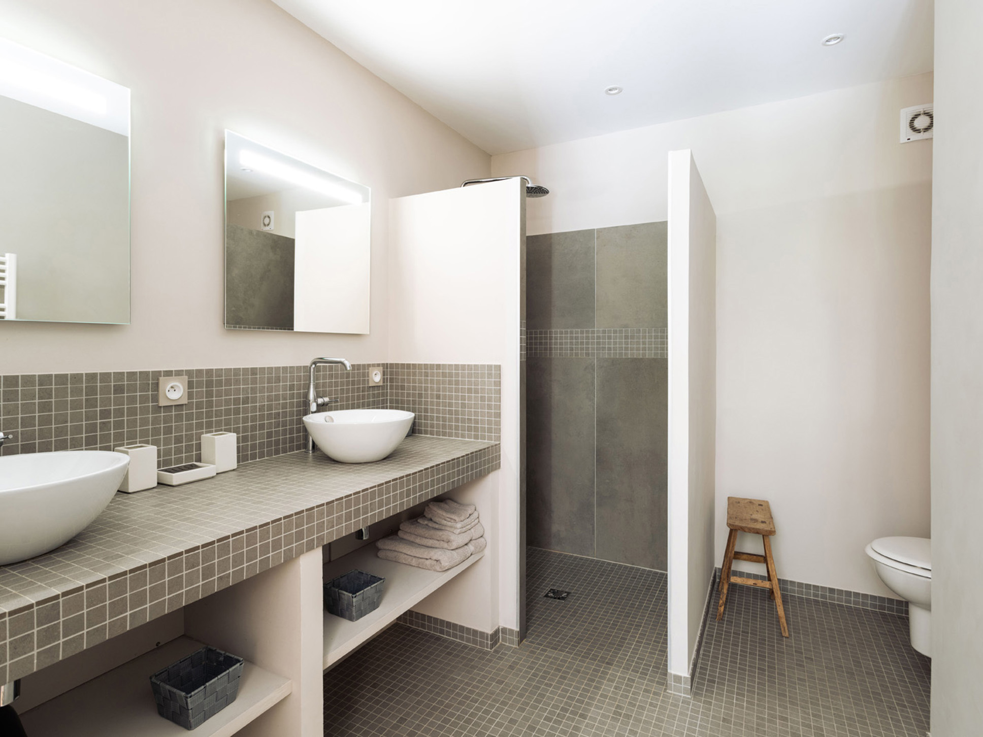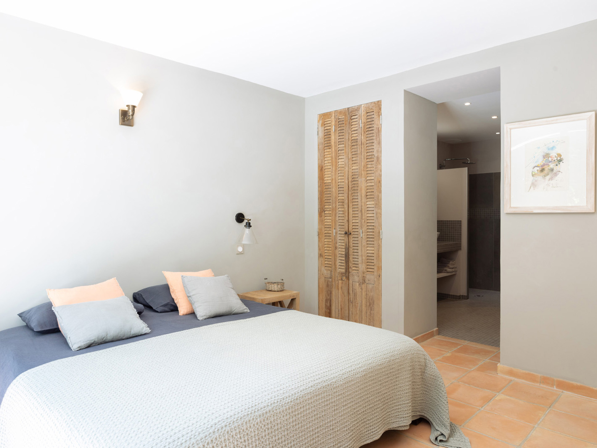 Slaapkamer 1 is voorzien van een tweepersoonsbed (180x200), vloerkoeling en een ensuite badkamer (wastafel, douche en separaat toilet). Slaapkamer 2 is voorzien van een tweepersoonsbed (2x90x200), vloerkoeling en een ensuite badkamer (wastafel en douche).