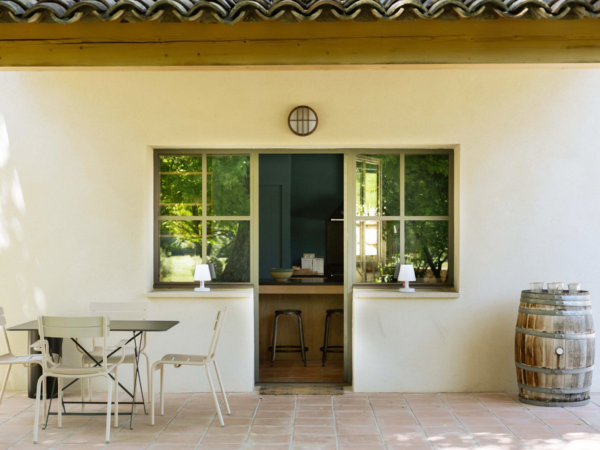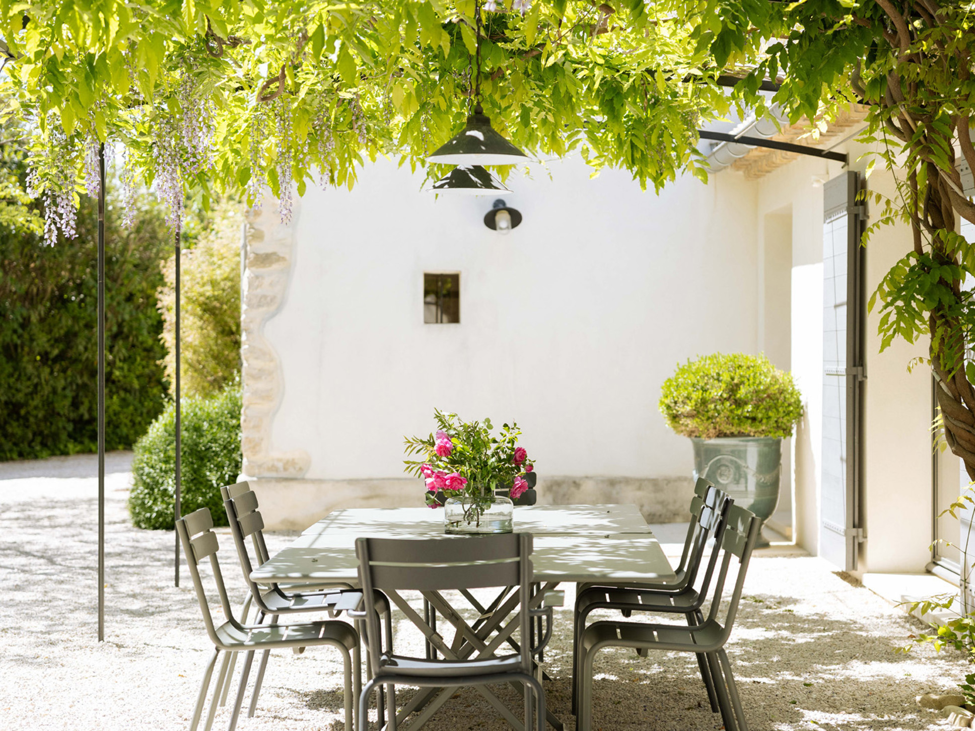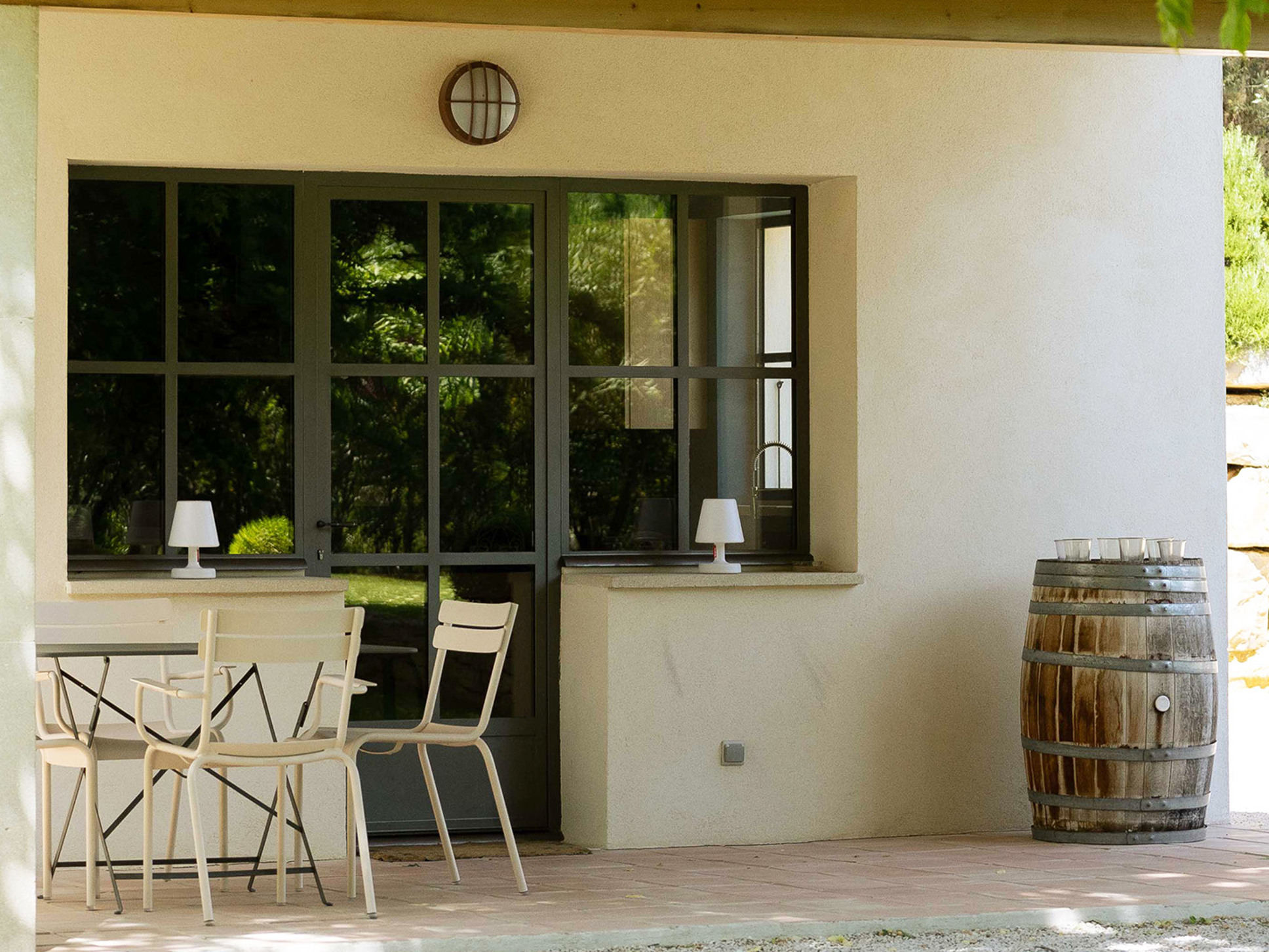 Openslaande deuren vanuit de living, eetkamer en keuken komen uit op het deels door een pergola overdekte terras. Hier staat een grote eettafel voor ontbijt, lunch en diner. Vanaf het terras heeft u een mooi uitzicht over de tuin. De tuin is vlak en voorzien van gras.