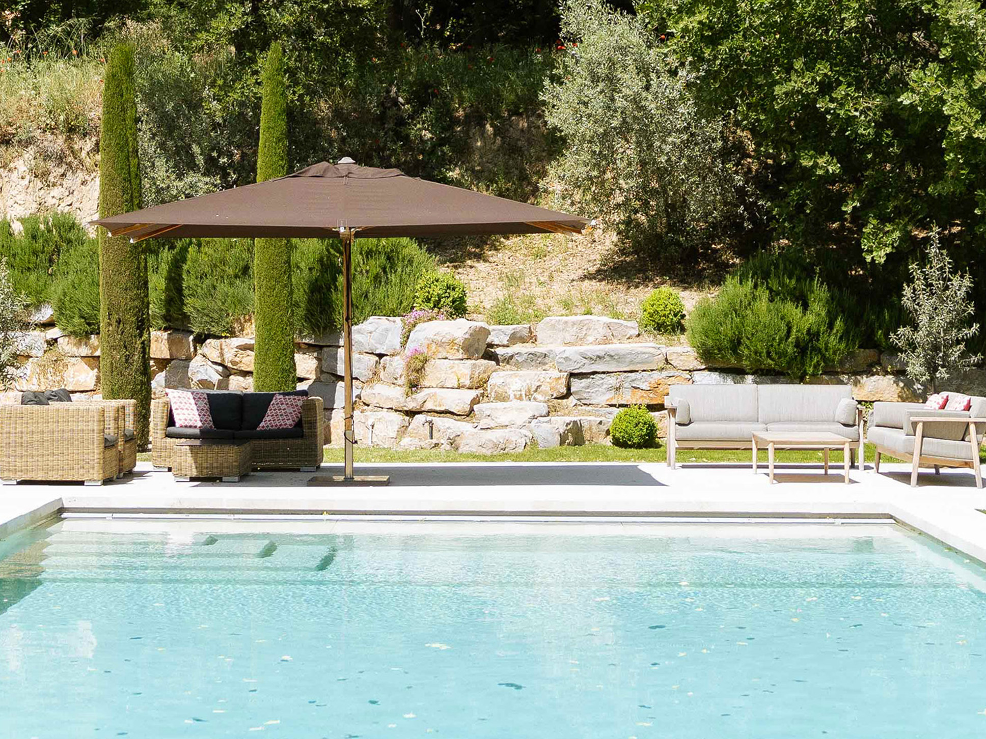 Haaks op de woning ligt het zwembad met een zonneterras. Op het zonneterras staat een moiie luxe loungeset en rond om het zwembad staan de ligbedden. Het zwembad meet 12 x 6 m en kan volledig afgedekt worden door een rolluik. Wel zo fijn met het oog op de veiligheid van de allerkleinsten.