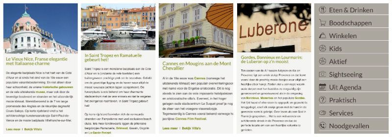 Of u nu de bruisende, mondaine sfeer van de kust gezellig vindt of dat u liever geniet van een rustig landelijk plekje: Zuid-Frankrijk heeft voor iedereen wat te bieden. Om u te inspireren hebben wij de Provence opgesplitst in maar liefst 14 Bestemmingen, die wij voor u uitgebreid beschrijven op onze website. Met onze eigen ervaringen, tips en foto’s erbij, dus alles uit eerste hand.