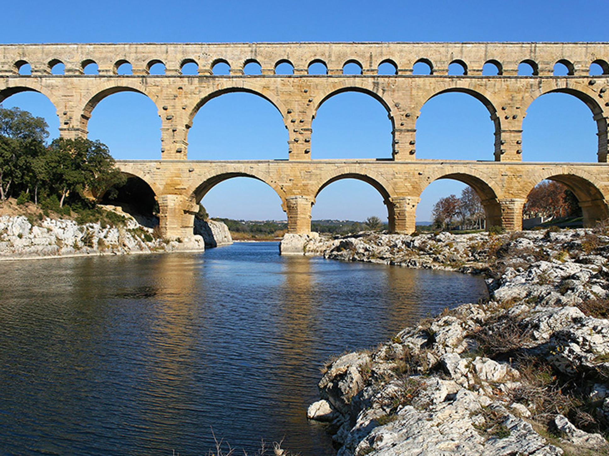 Het iconische aquaduct Pont du Gard werd door de Romeinen gebouwd in de 1e eeuw na Christus. Nu is het een plek waar je kan kanoën door stroomversnellingen, te paard door de rivier kan waden, of op de vele strandjes kan zonnen en genieten.